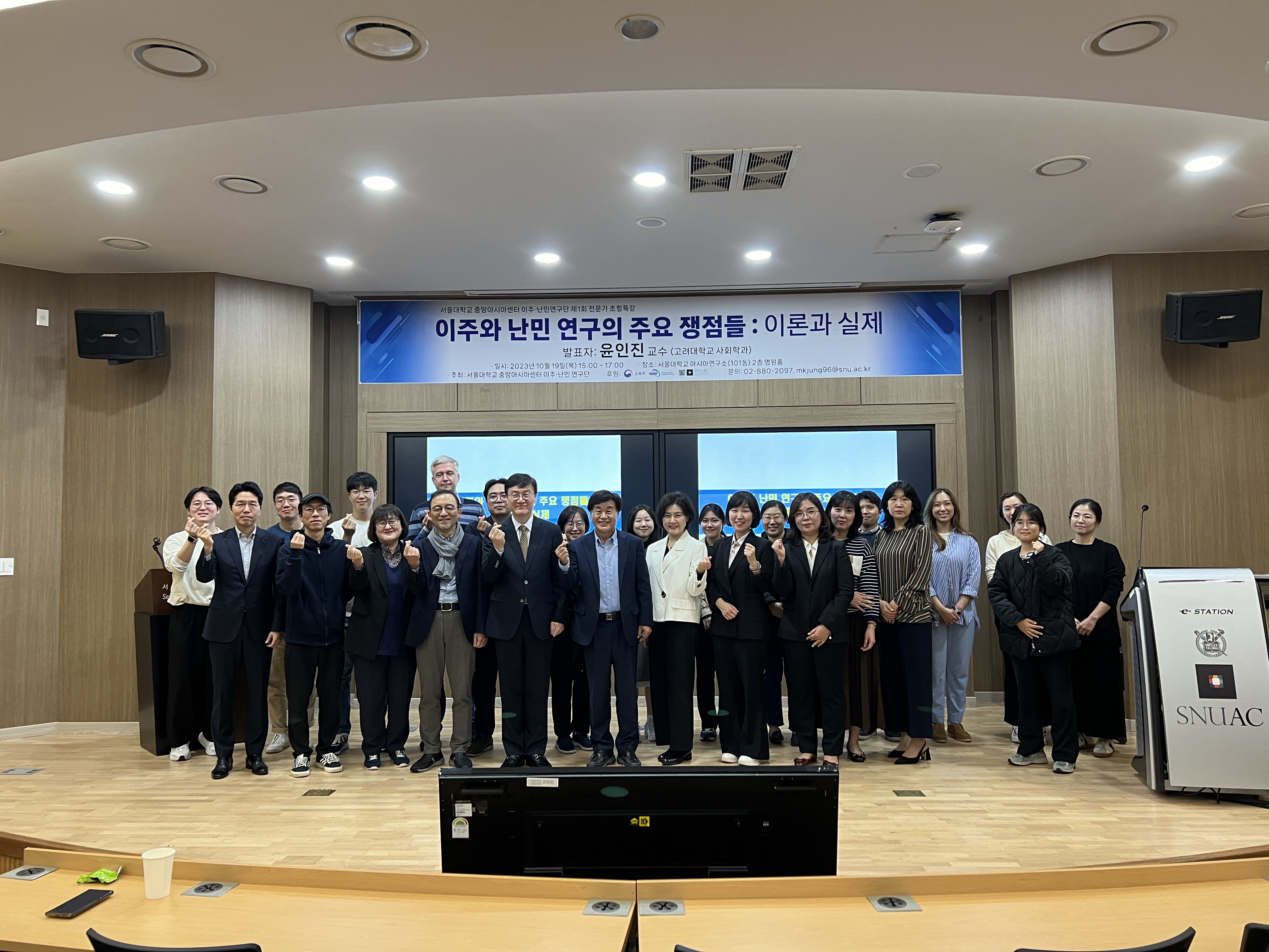2023년 11월 27일서울대학교 중앙아시아센터는 한국연구재단의 연구소 지원사업에 선정되어 2023년 9월부터 ‘이주·난민연구단’을 결성하여 ‘경계를 넘는 이주자로서 유라시아 난민 연구: 이주 동학의 다면적 변화와 영향’이라는 제하에 연구를 시작하였다. 그 첫 번째 행사로 이민학회 학회장인 윤인진 교수(고려대)를 초청하여 국내외 이주와 난민 연구의 주요 쟁점들을 짚어보고, 이주·난민 연구의 나아갈 방향을 함께 모색해 보는 특별강연을 개최하였다. 이주·난민 연구에 관심 있는 30여 명의 학자가 참석한 이 행사에서는 한국 이민 정책의 방향성에 대하여 심도 있는 논의가 오갔다.
