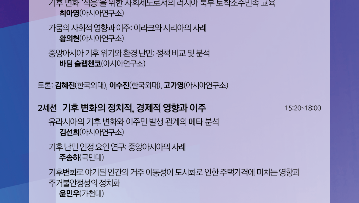 이번 학술회의는 유라시아 지역에서 나타나는 기후 변화와 이주의 복합적 관계를 심층적으로 탐구함으로써, 기후 위기가 초래하는 구조적 변화를 다면적으로 이해하고 향후 정책적‧학술적 대응 방향을 제시하는 데 중요한 계기가 되었다.